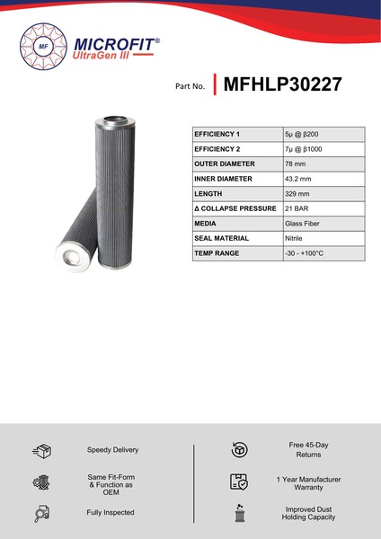 Genuine MICROFIT® UltraGen III MFHLP30227 Pressure Filter. Engineered and manufactured in Great Britain the MFHLP30227 is designed to meet or exceed the quality and performance of OEM quality standards, ensuring superior filtration performance and the longest possible filter life.Building on over 50 years of filtration expertise, the UltraGen III series is the third generation of MICROFIT® filter media, delivering exceptional efficiency and reliability.